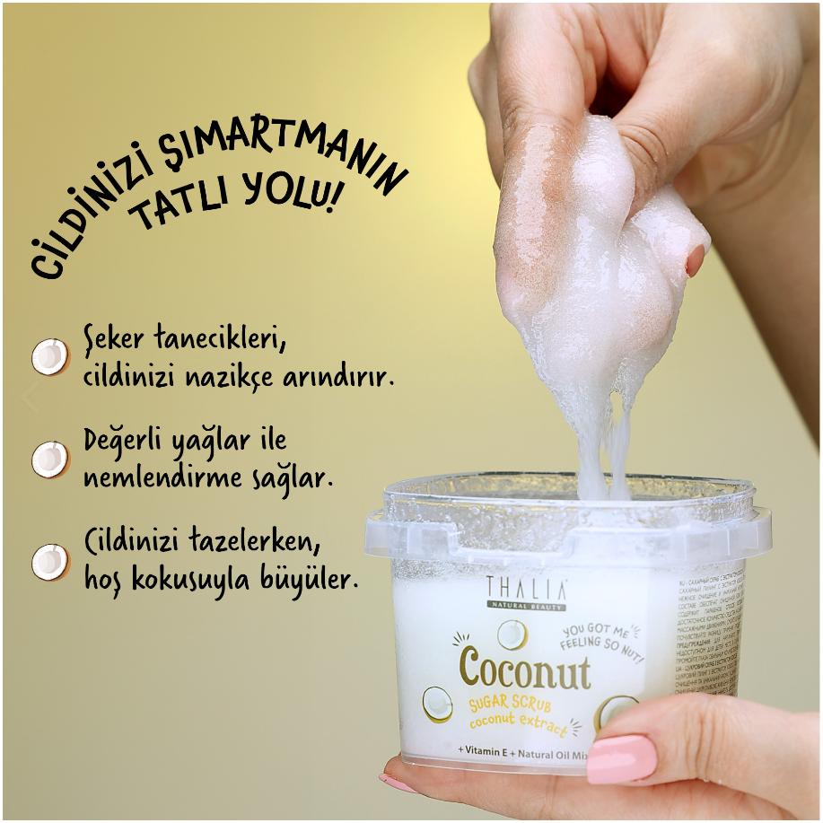 Das mit Kokosnussextrakt angereicherte Peeling hinterlässt ein tropisches Frischegefühl und sorgt für eine fühlbar weiche und strahlende Haut. Thalias Körperpeeling mit Kokosnussextrakt bietet luxuriöse, natürliche Pflege für Ihre Schönheitspflege und verwöhnt Ihre Haut.