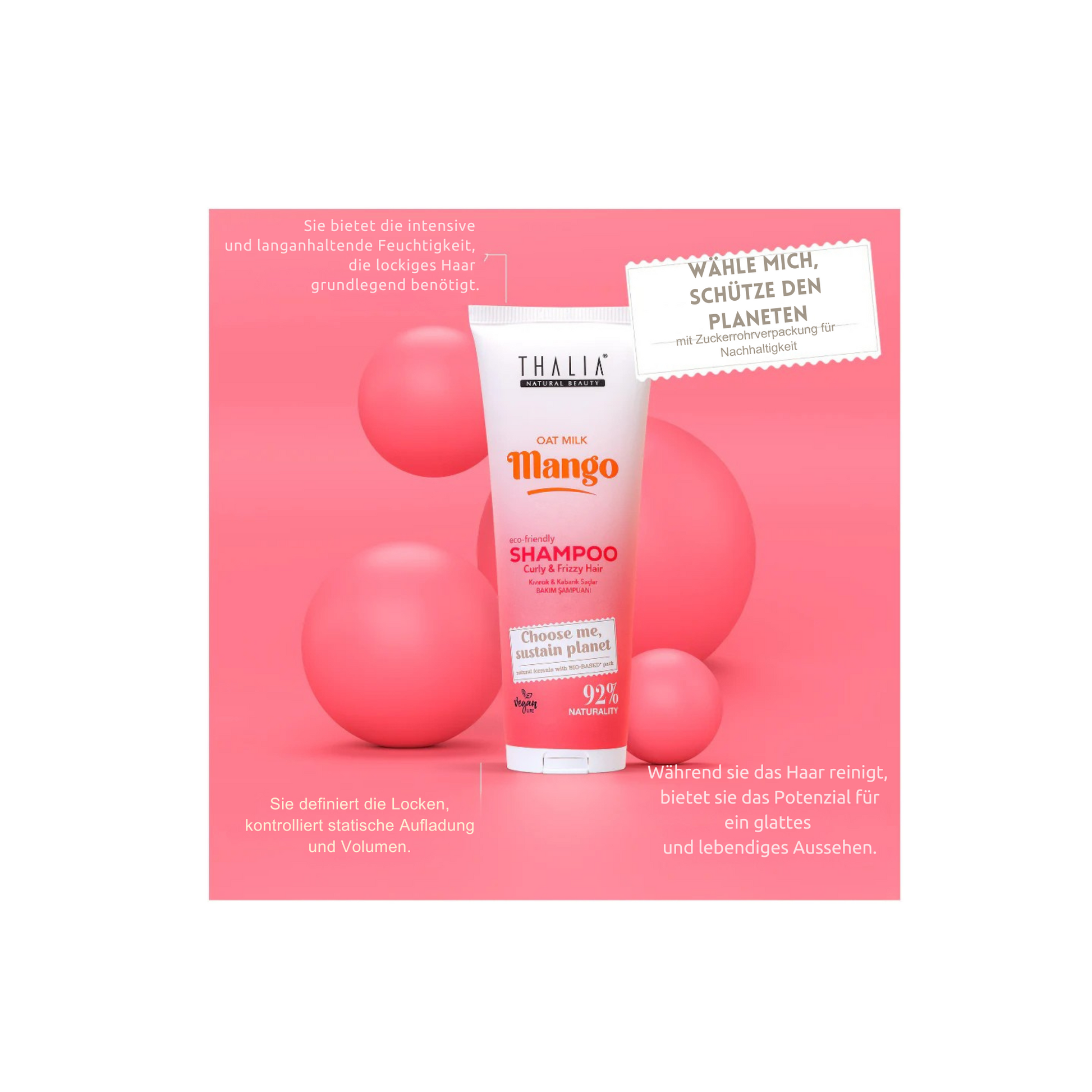 Die Thalia Hafermilch & Mango Pflege-Shampoo, speziell entwickelt für lockiges und voluminöses Haar, konzentriert sich auf die grundlegenden Bedürfnisse von lockigem Haar und bietet intensive und langanhaltende Feuchtigkeit durch eine spezielle Formel. Die natürlichen Inhaltsstoffe der Hafermilch, einschließlich Vitamin E und Ferulasäure, helfen, Haarbruch zu reparieren, Frizz zu verhindern und Volumen zu kontrollieren. Die Vitamine im Mango-Extrakt unterstützen die Entwicklung von lebendigem, starkem und glänzendem Haar. Zudem verstärkt das in der Mango enthaltene Vitamin C die Locken und verleiht dem Haar eine kraftvolle und glänzende Wirkung.