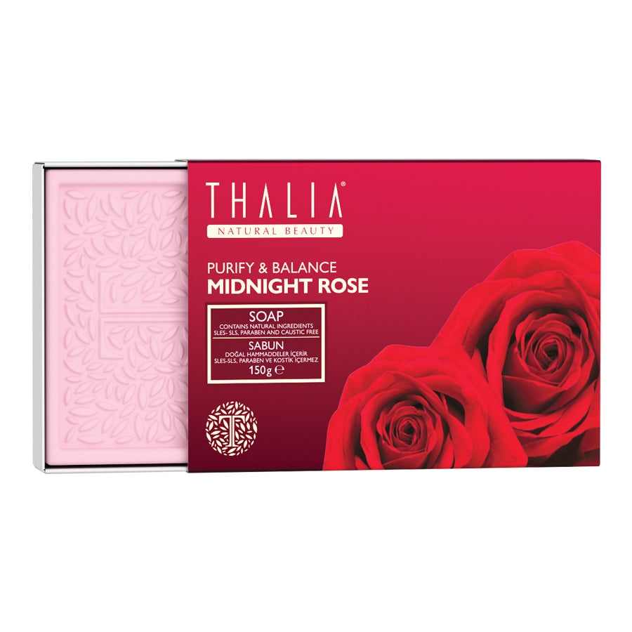 Thalia Midnight Rose Reinigende & Balancierende Naturseife befreit die Hautoberfläche von Schmutz und überschüssigem Öl. Das Rosenwasserextrakt versorgt die Haut mit Feuchtigkeit und verhindert das Austrocknen.
